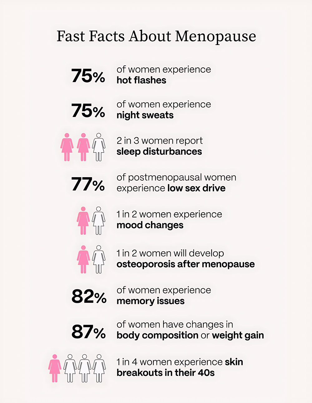 - Thinning hair & Dry skin : Lower estrogen levels affect skin elasticity & hair growth.