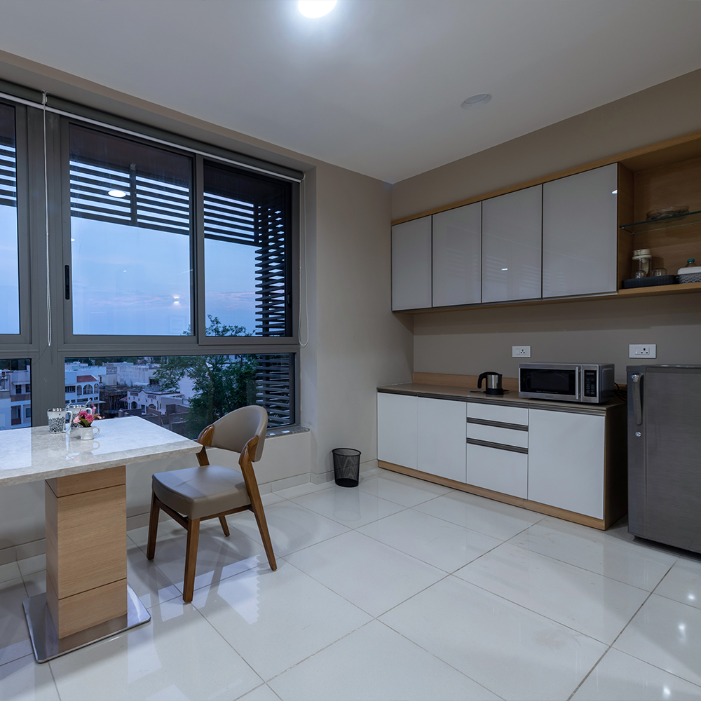 - Pantry with microwave, coffee machine, kettle and basic crockery.